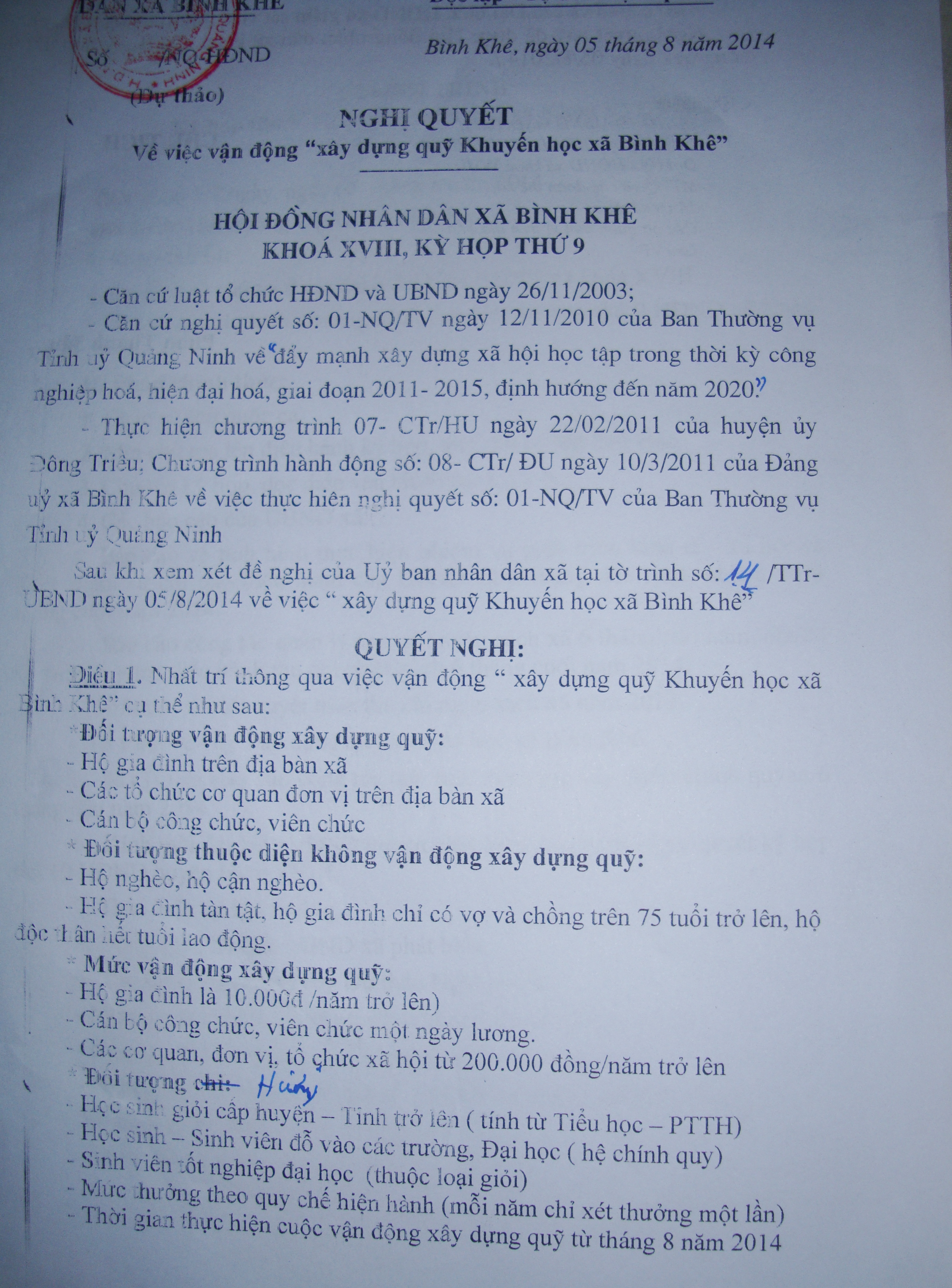 Nghị quyết về việc vận động Xây dựng quỹ khuyến học xã Bình Khê